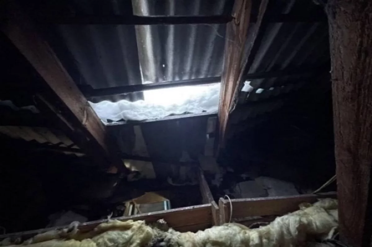 Кровля разрушилась над первым подъездом дома. Сейчас управляющая компания устраняет последствия коммунальной аварии.