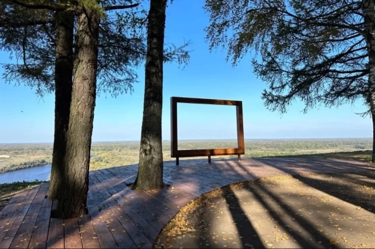 «Венец» — самая высокая смотровая точка Вязников с видом на Клязьму и заливные луга. В 2025 году там завершили первый этап работ: убрали больные деревья, проложили брусчатые дорожки и установили арт‑объекты. Одним из новшеств стала деревянная фотозона с рамой, которая лаконично вписалась в парк и привлекает жителей и туристов.